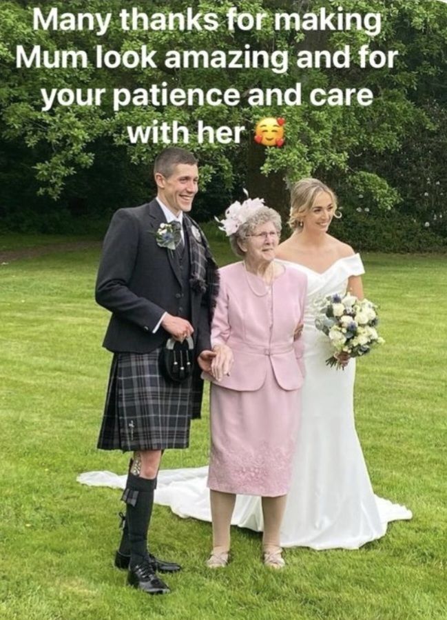 Thank you so much for the care and attention you showed to Grannie (Florence). She looked amazing and really enjoyed her grandson’s wedding day.